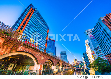 日本の東京都市景観 万世橋からマーチエキュート神田万世橋や神田川などを望む(奥は御茶ノ水駅方向)