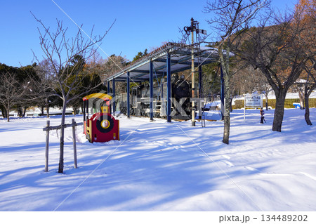 雪の積もった湖畔の公園とボート