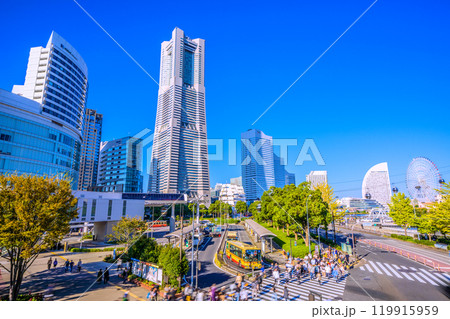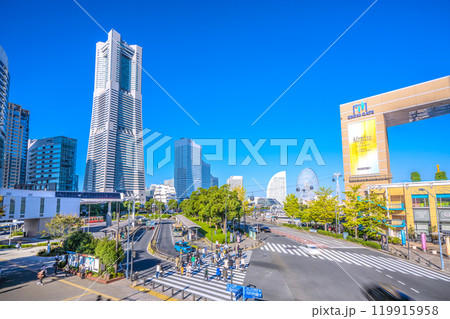 日本の横浜都市景観10月5日。桜木町駅や桜木町二丁目交差点、横浜ランドマークタワーなどを望む