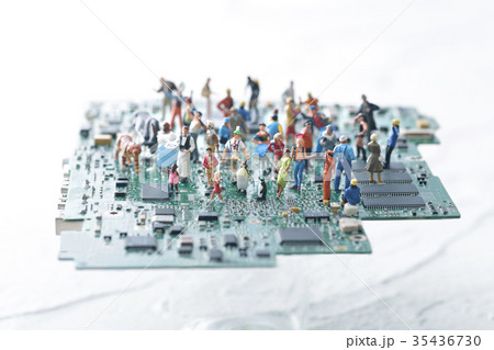 コンピューターの基盤の上にいる人間のミニチュア人形