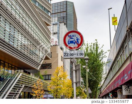 銀座のタクシー乗車禁止地区であることを示す標識とタクシー乗り場の案内図