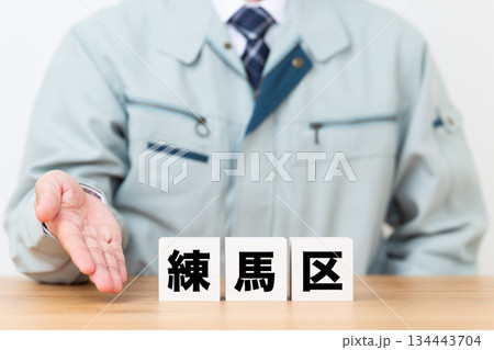豊島区のブロックと作業着を着たミドル男性ビジネスマン