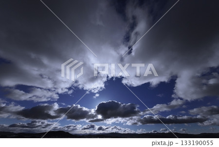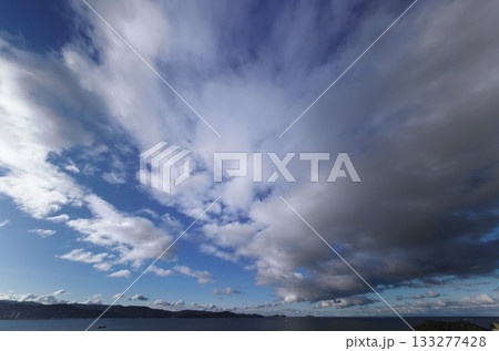 爽やかな青空に雲がダイナミックに広がった朝空・冬・超広角・空主体・240226am