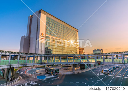 日本の横浜都市景観 インバウンド…(賑わう)新横浜駅や飛行機雲、太陽などを望む。新時代へ