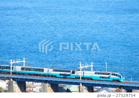 相模湾を見下ろす鉄橋を渡るスーパービュー踊り子号