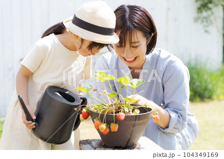 家庭菜園を楽しむ親子の写真