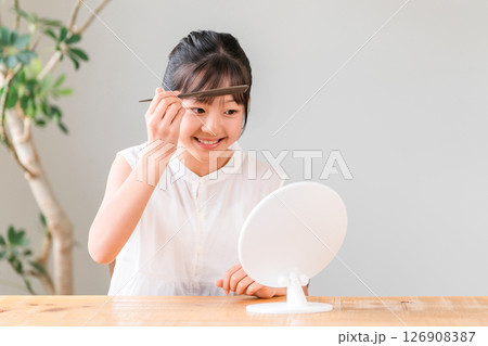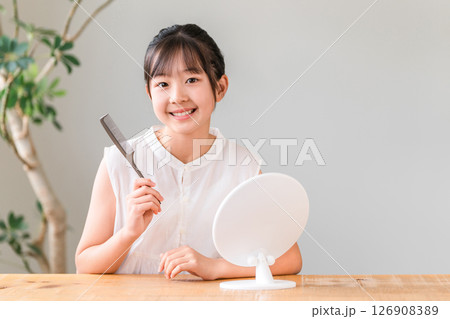 鏡を見ながらヘアセットする子供,女の子,小学生,中学生