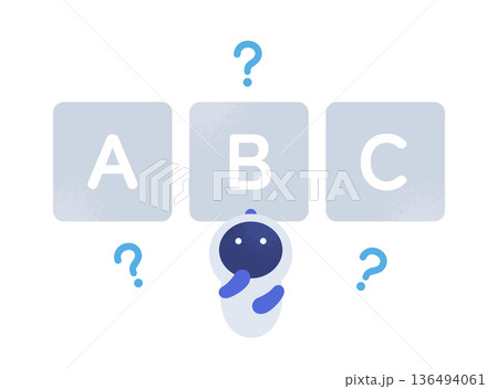複数の選択肢で迷うAI。最適解を求め考えるロボットのベクターイラスト素材。