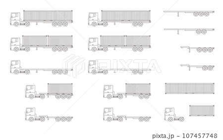 海上コンテナを輸送するトラック・セミトレーラーの線画ベクターイラストセット