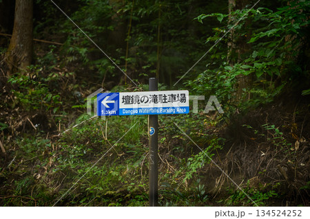 森林の中の滝駐車場への案内標識