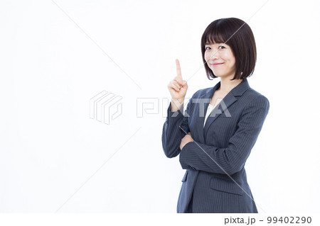 AI生成画像 白背景の人差し指を立ててポーズをする若いビジネスウーマンのポートレート