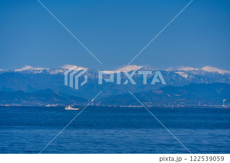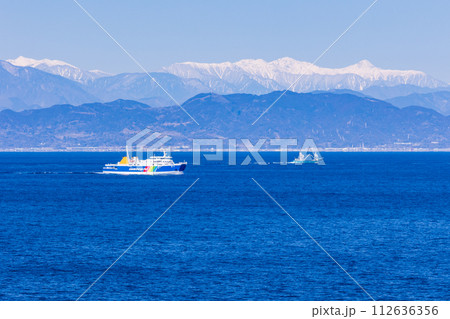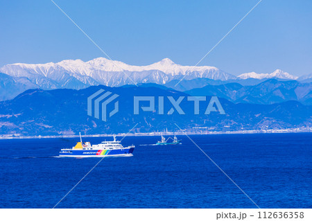 (静岡県)雪化粧した南アルプスを背に、土肥港に向かう駿河湾フェリー