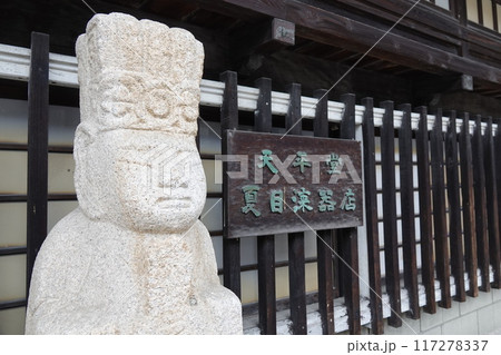 木曽路の出入り口 中山道贄川宿の風景 店前の石像