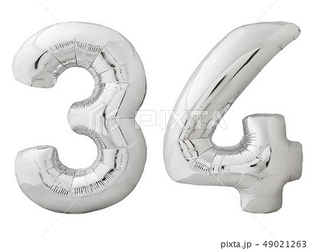 Silver number 34 thirty four made of inflatable balloon isolated on white
