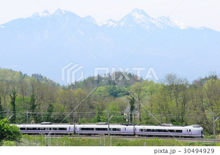 八ヶ岳を望む新緑の新府桃源郷を行く中央線特急スーパーあずさ号