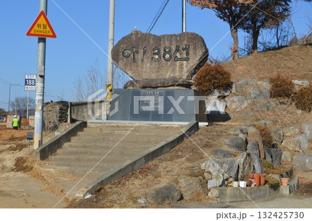 韓国 江原特別自治道麟蹄郡にある38度線石碑と休憩所の風景