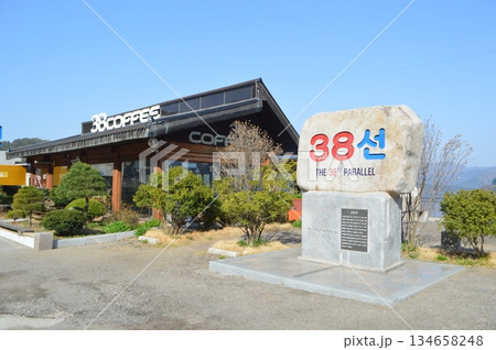 韓国 江原特別自治道麟蹄郡にある38度線石碑とカフェの風景
