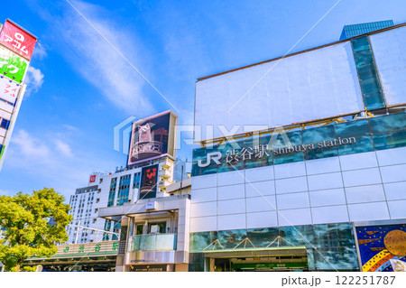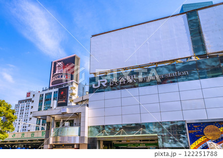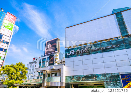 日本の東京都市景観 早朝…。ハチ公改札側から渋谷駅や山手線、3Dハチなどを望む=21日