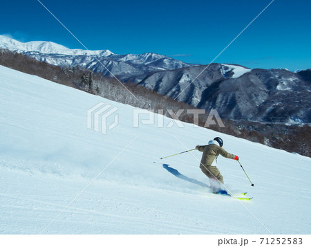 白馬八方尾根スキー場 白馬三山を背景に黒菱ゲレンデを滑るスキーヤー