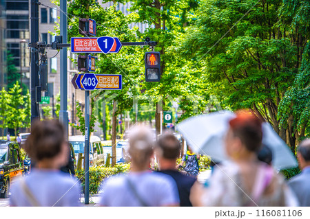 日本の東京都市景観 緑に映える大手町の交差点。外国人観光客らの姿も…4段に並ぶ道路標識・日比谷通り…