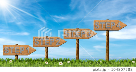 Step by Step Concept - Four Wooden Directional Signs on a Countryside Landscape