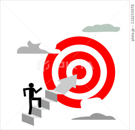 Businessman walking up on arrow shooting toward target sign, Stairs design infographic template with four steps, Men on stair to success