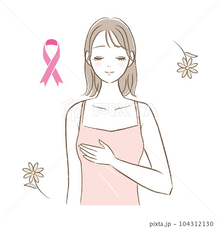ピンクリボン 乳がんチェックをする若い女性イラスト