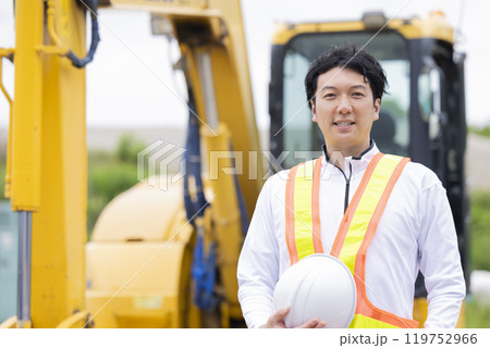 倉庫・作業場・工場にいる建築業・土木業の作業着姿の中年男性