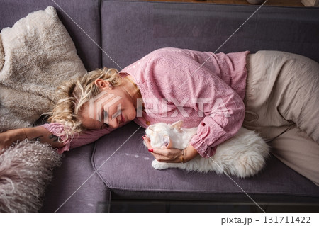 Mid adult woman sleeping with cat on sofa