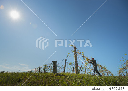 A vineyard with young vines being trained along wires to produce a good grape harvest.