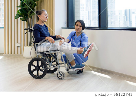 Young asian physical therapist in blue uniform help an elderly patient in a wheelchair lift her leg to relieve pain.