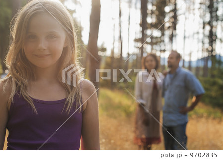 A young girl with long blonde hair in woodland in the fresh air.