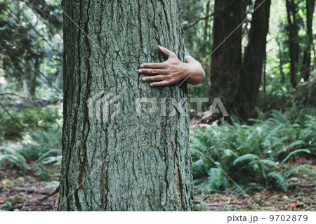 Man hugging tree in lush, green forest