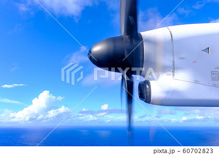 南国の海を飛ぶプロペラ機