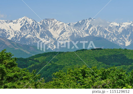春の白馬村国道406号から望む新緑と残雪の白馬三山(白馬鑓ヶ岳・杓子岳・白馬岳)