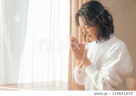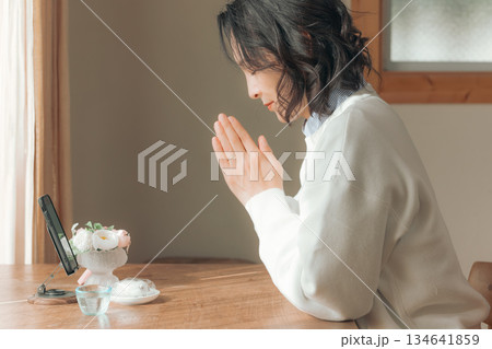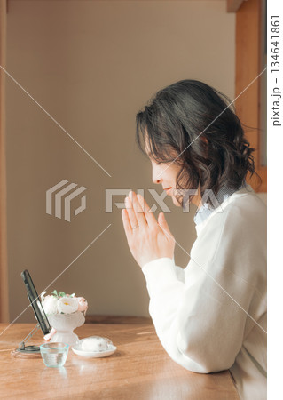 自宅で故人に祈りを捧げるミドル女性