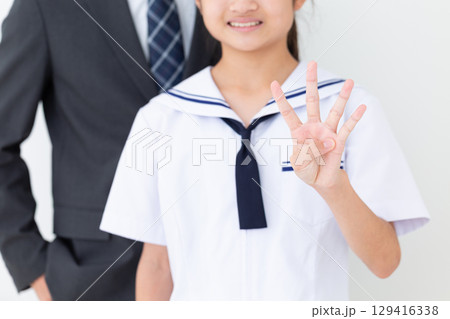 4本指を立てる夏の学生服を着た中学生の女の子とスーツ姿のお父さん