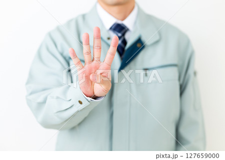 4本指を立てる作業着姿のミドル男性ビジネスマン
