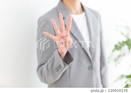 指を4本立てるグレーのスーツ姿のミドル女性ビジネスウーマン