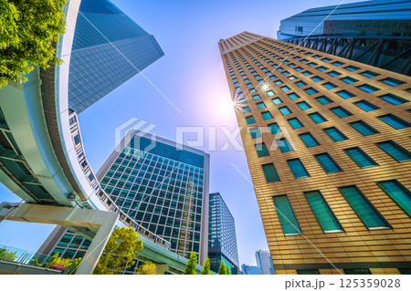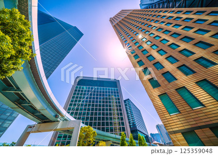 日本の東京都市景観 Wダイヤモンドの珍景…汐留のビル群などを望む(ゆりかもめの連続Pあり)