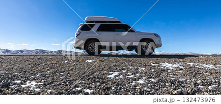 Tibet,China - June 14,2023 ,Driving Toyota off road car on the high altitude grassland mountains