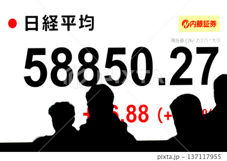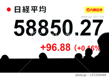 日本の東京都市景観最高値更新5万8753円39銭株価/終値。一時初の5万9000円台乗せ=2月26日