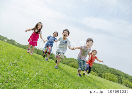 公園の丘を手をつないで駆け上がる小学生たちの後ろ姿