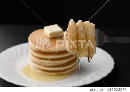 蜂蜜をかけたホットケーキをフォークで持ち上げる