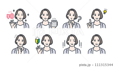 スーツを着たミドル女性のシンプルな表情アイコンイラストセット素材