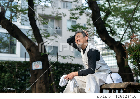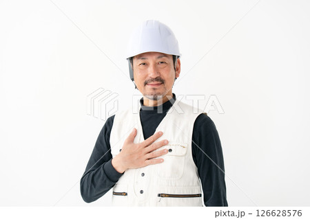 作業服の男性 公園 ヘルメット ガッツポーズ