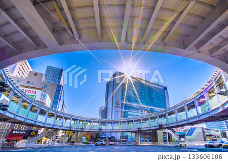 日本の横浜都市景観躍進する新横浜。新横浜駅や円形歩道橋などを望む。新時代に希望の光=27日