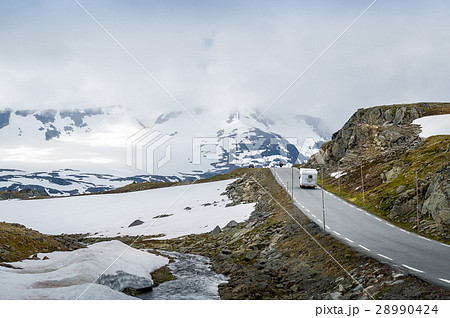 view from Sognefjellshytta with blue glacial lake Fantesteinsvatnet along road 55 National scenic