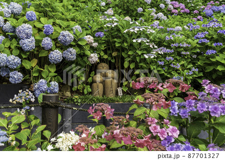初夏 鎌倉明月院(あじさい寺)のお地蔵さま紫陽花を抱く