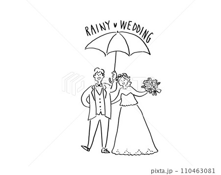 傘をさした新郎新婦、ウエディング、結婚式、雨の日、線画